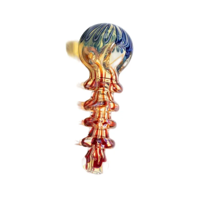 5" size for a comfortable, portable feel Ribbed/stacked-spine body for an ergonomic grip Blue and yellow wig-wag swirl bowl Iridescent amber/red fumed glass neck Durable, heat-resistant construction Artistic twist on the classic spoon pipe Sold as 1 Count Design and Color may vary