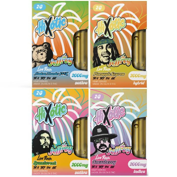 All New Blend! Your new favorite 2 gram cart will be Alaskan ThunderF##k and it will hands down be the dopest dope you've ever smoked. Are you looking for that perfect Sativa that tastes incredible? If so, our all-new Pineapple Express 2 Gram Live Resin THC-A+ THC-P + HHCP + Delta 8 + Delta 10 Cart is for you. This Cart is made using advanced materials including a carefully constructed coil that preserves the flavor and allows for smooth hits without the high risk of clogging. You will enjoy a consistent experience that delivers the perfect dose of hemp time and time again. This vape cart contains 2000mg of hemp and comes full of some satisfying vapor and flavor production all day long. Hixotic's The Jeffrey Cart Features: Each vape cart contains THC-A+ THC-P + HHCP + Delta 8 + Delta 10 hemp extract in a high-quality 2-gram cart. Live Resin. THC-A with less than .3% Delta 9 THC. THC-P with less than .3% Delta 9 THC. Delta 10 with less than .3% Delta 9 THC. Delta 8 with less than .3% Delta 9 THC. HHCP with less than .3% Delta 9 THC. This device is federally legal, but it's recommended to verify whether or not your state is restricted.
