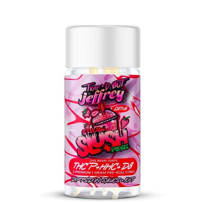 Hixotic Trap'd Out Jeffrey Pre Rolls 5g: Strength: 5g (5000mg). Capacity: 5 Joints Per Jar. 3rd Party Lab Tested. Great for Relaxing and Stress Free Feeling. Flavor Profile : Strawslush Diesel – (Sativa) THCP + HHC + D8, Dipped in Sauce + Kief Blue Cotton Candy – (Hybrid) blend of THCP + HHCP + D8, Dipped in Liquids Diamonds + Kief Peach Ringz OG – (Indica) THC-A + THCP + D8, Dipped in Rosin + Kief London Pound Cake – (Indica) Includes: 6 x Hixotic Trap'd Out Jeffrey Pre Rolls 5g.