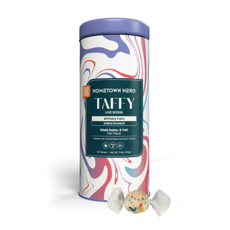 Shop Hometown Hero Birthday Cake Delta-9 Live Rosin Taffy Order Hometown Hero Birthday Cake Taffy online — a nostalgic, sweet vanilla treat infused with 15mg of hemp-derived Delta-9 THC and premium indica live rosin for deep relaxation. Each chewy piece is handmade by a historic confectioner and individually wrapped for freshness. You’ll get all the flavor of rainbow sprinkles and buttercream frosting, with the body-focused calm of indica-forward effects. Product Highlights Strength: 15mg Delta-9 THC per piece Effect: Full-body calm and mellowing indica experience Flavor: Sweet vanilla, buttercream, and rainbow sprinkles Occasion: Evenings in, post-dinner dessert, gentle wind-down Experience: Slow, smooth onset from solventless live rosin Quality: Artisan-made, small-batch, and individually wrapped What Makes This Taffy Special? Hometown Hero’s Birthday Cake Taffy delivers more than flavor — it’s infused with both Delta-9 distillate and Absolute live rosin for a high that’s both pot...