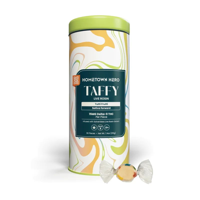 Shop Hometown Hero Tutti Frutti Delta-9 Live Rosin Taffy Order Hometown Hero Tutti Frutti Taffy online — a bright, fruit-packed edible infused with 15mg of hemp-derived Delta-9 THC and premium sativa live rosin extract. Each piece is handmade by a historic confectioner and individually wrapped, delivering classic saltwater taffy flavor with an uplifting, mind-focused buzz. It’s your childhood favorite, reimagined with a cannabis twist. Product Highlights Strength: 15mg Delta-9 THC per piece Effect: Energizing, creative, and mentally elevating Flavor: Mixed fruit blend with sweet, vibrant notes Occasion: Midday pick-me-up, social hangs, creative work Experience: Sativa-driven clarity from solventless live rosin Quality: Artisan-crafted, small-batch, and individually wrapped What Makes This Taffy Special? Tutti Frutti brings the flavor of old-school candy and the energy of modern cannabis together in one chewy bite. Each taffy is infused with Delta-9 distillate and Absolute sativa liv...