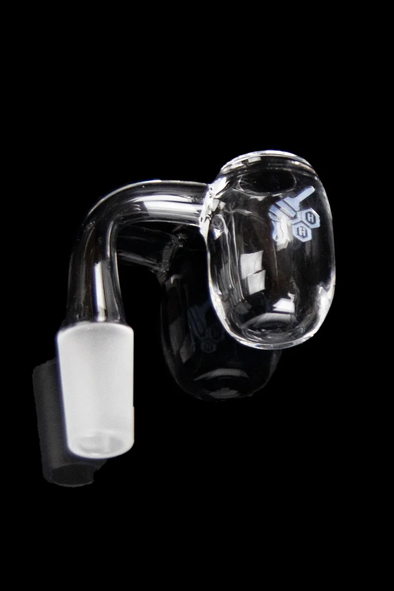 Boost your rips with the Honey Barrel quartz banger, designed for impressive vapor retention. This piece stands out with its honey pot shape and a bowl at the bottom which focuses heat on one point, adding intensity to your hits. Since this piece has such a unique design, it was built with 3mm thick quartz to ensure the durability you need. With all these details considered, this banger will soon become your favorite dabbing companion. The piece has a 20mm outer diameter and a flat-top design. The frosted joint sits at a 90-degree angle and comes in multiple sizes.