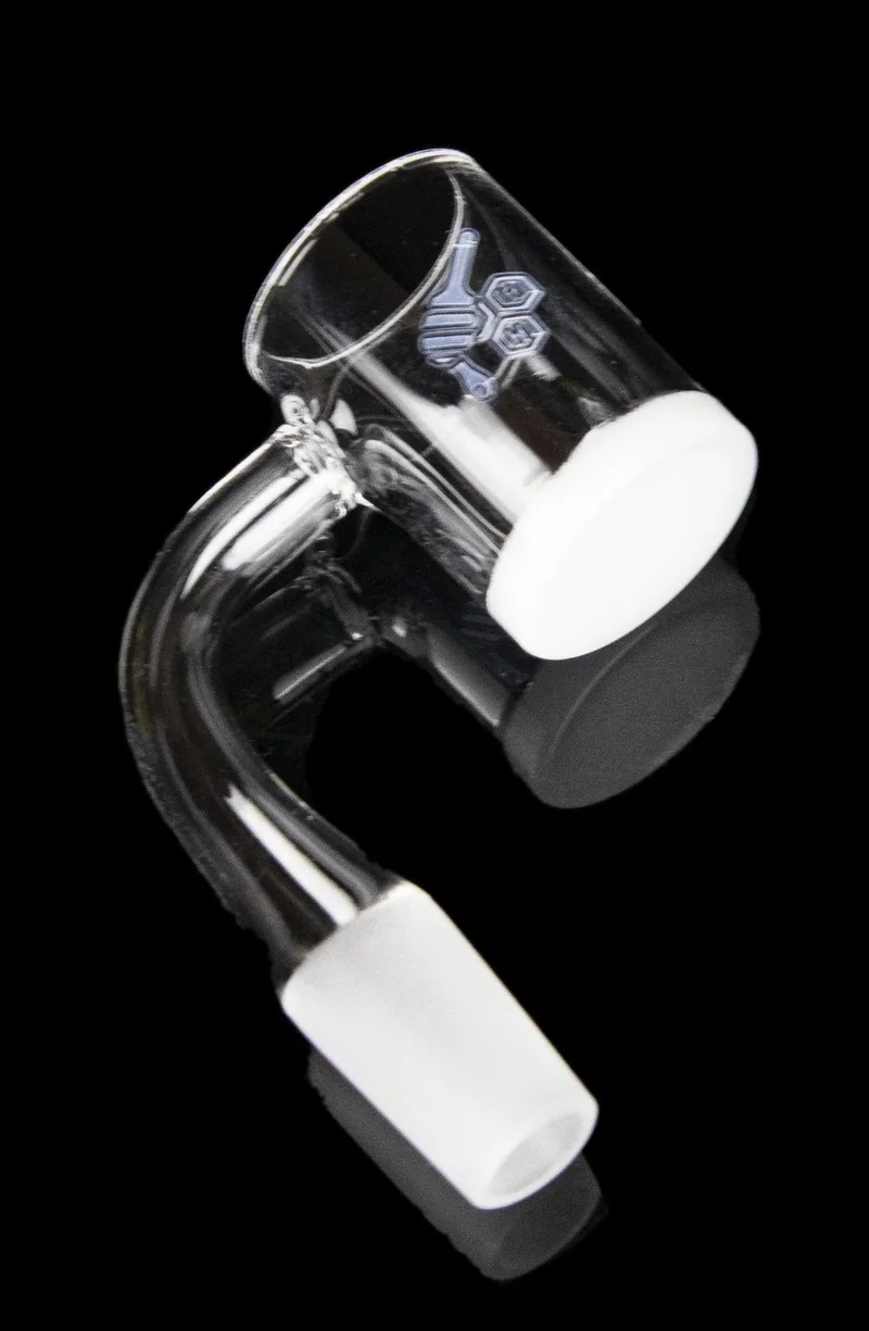 This sleek banger is part of Honeybee Herb's "Honey and Milk" series. It stands out with its classy clear quartz construction with opaque white bottom and a frosted joint. The banger has an outer diameter of 25mm and a flat top for an easy match with a carb cap. It's made with 2mm thick quartz and has a 4mm thick base to ensure fantastic durability and heat retention. It can withstand high torch heat and will distribute it rapidly and evenly, minimizing waste and maximizing vapor production. The banger has a male joint and a 90-degree angle.