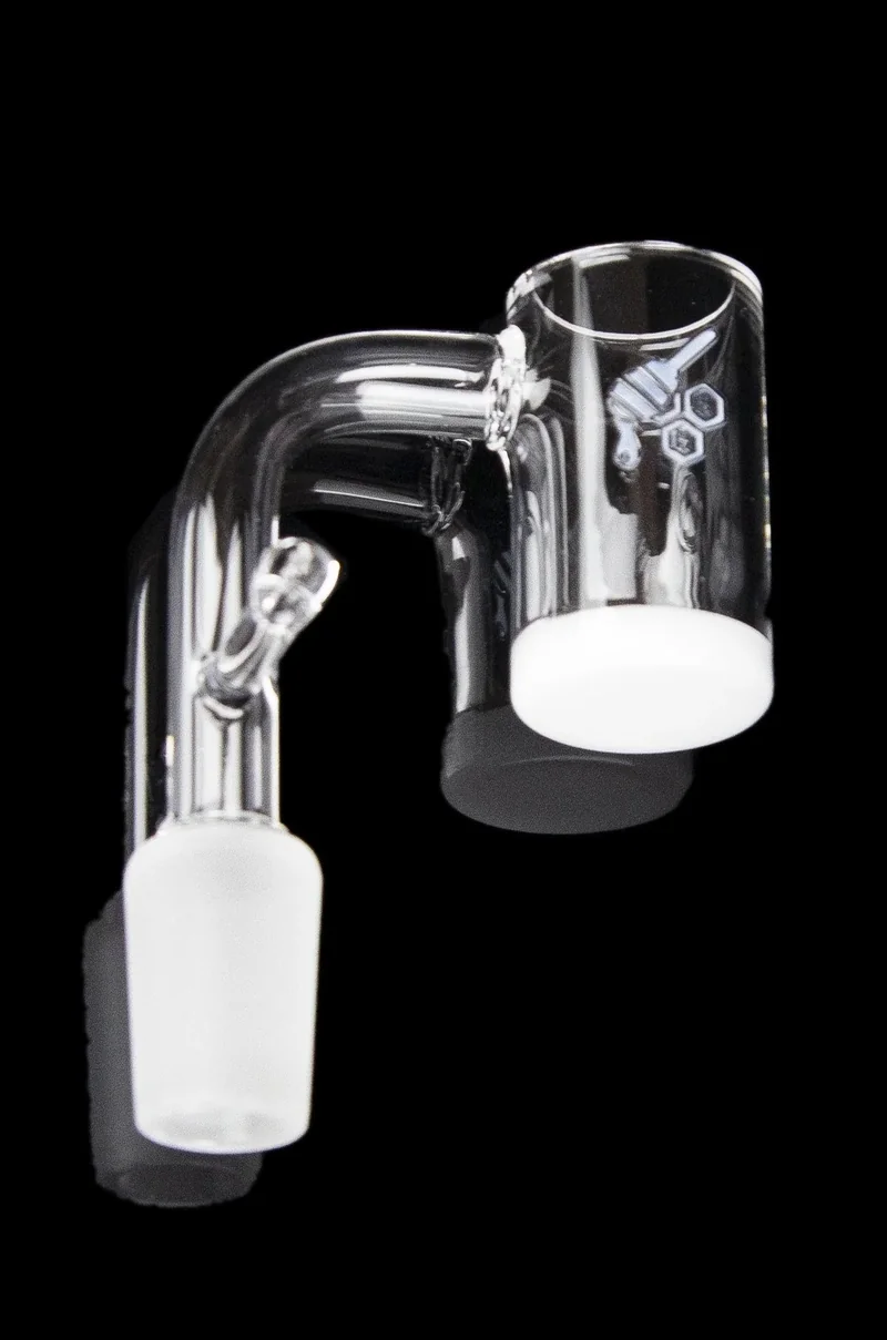 Another fine piece from Honeybee Herb's "Honey and Milk" series, this flat top-banger is specially designed for use with e-nails. The piece is made with top-of-the-line 2mm thick quartz and has a white opaque 4mm thick base for impressive heat retention and efficiency. The outer diameter of 20mm allows easy loading and the flat top allows an easy match with a carb cap. The banger has a 90-degree frosted joint, so it'll work with rigs that have a downstem at a 90-degree angle. If heated with butane torches only and cleaned correctly, this premium banger will serve you for years. A great choice for every enthusiast who seeks the highest quality tools.