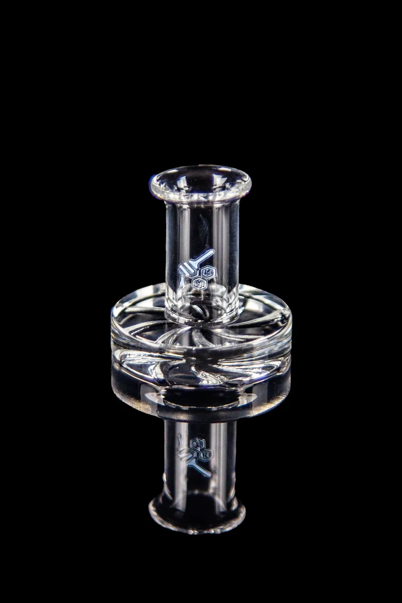 Balancing form, function, and classy style, the Quartz Stamp Carb Cap by Honeybee Herb is pleasantly dense and is compatible with most quartz buckets. This clear carb cap is made of quality quartz and it's adorned with the Honeybee Herb logo to remind you it's a quality dabbing accessory. Pair this carb cap with your favorite bucket and enjoy less concentrate wastage and more dabbing pleasure with every rip you take. This carb cap is easy to grip and the flat bottom ensures it will fit snugly over the top of any flat-top banger nail. Outer Diameter - 30mm