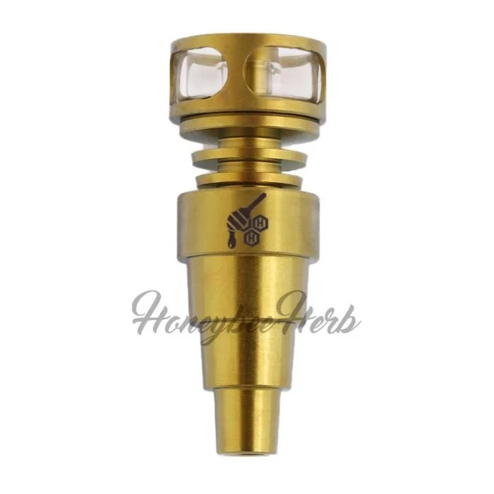 Universal 6-in-1 Connection. Grade 2 Titanium. Quartz Dish 22.5mm. Fits 10mm, 14mm, 18mm Joints. Compatible with Male & Female Joints. Compatible with Most 27mm Carb Caps. Butane Torch Recommended. Aesthetically speaking, the Titanium 6-in-1 Cage Hybrid is blowing minds across the globe! These dope bangers are changing what we expect to see when someone whips out their favorite titanium piece. The shape of these is beyond unique, and these are flying out of our inventory like you wouldn’t believe! Crafted from Grade 2 Titanium, these pieces feature a universal 6-in-1 connection that dabbers can’t get enough of. And with a 22.5mm quartz dish, inhaling fat slabs has never been easier. If your dish ever breaks, we also have you covered with our spare dishes too. These fit 10mm, 14mm, and 18mm joints, and with them being compatible with male and female joints, the versatility the Titanium 6-in-1 Cage Hybrid is boasting is unreal. It’s also compatible with the majority of 27mm carb caps!