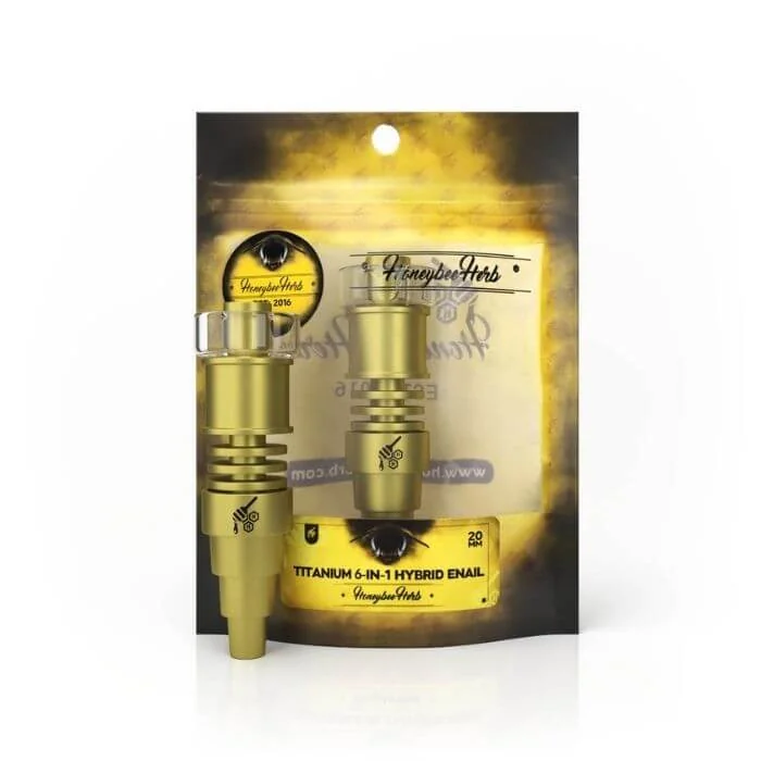 Universal 6-in-1 Connection. Grade 2 Titanium. Quartz Dish 25mm. Compatible with Male & Female Joints. Fits 10mm, 14mm, 18mm Joints. Compatible with Most 27mm Carb Caps. Everyone needs a quality enail, and if you’re in the market for one with a universal 6-in-1 connection, you’ll want to add a Titanium 6-in-1 Hybrid Enail to your cart now. These bad boys are seriously incredible, bringing on those legendary dab hits most dabbers only dream of. Whether you’ve been dabbing for years or just bought your first bit of concentrate yesterday, this is an enail that’s sporting some easy usability you’ll appreciate. These are crafted from the finest Grade 2 Titanium, making them beyond durable. And the quartz dish is 25mm in diameter, allowing monster slabs and beastly dabs you won’t soon forget. Don’t forget your spare quartz dish just in case! You’ll enjoy the compatibility of these sport too, allowing them to be used with male and female joints. These will also fit 10mm, 14mm, and 18mm joints, making it so you won’t have any trouble getting this to fit your favorite rig. And if you have a 27mm carb cap, it’s likely compatible with that too.