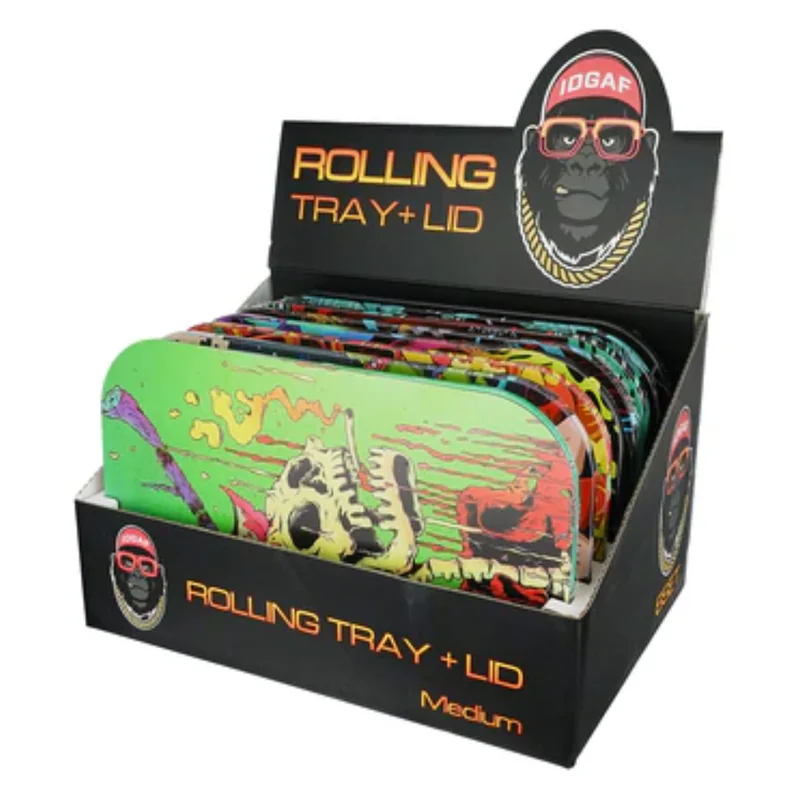 IDGAF MEDIUM ROLLING TRAYS WITH LID ASSORTED DESIGNS DISPLAY OF 8 Keep smoking sessions neat and discreet with the IDGAF Medium Rolling Trays with Lid – Assorted Designs, Display of 8 . Made from durable, lightweight metal , these trays feature a fitted matching lid , giving customers the ability to cover their prep area and store materials without spills or mess. The medium size provides a larger rolling surface than the small trays, making it perfect for home use while still easy to store or t