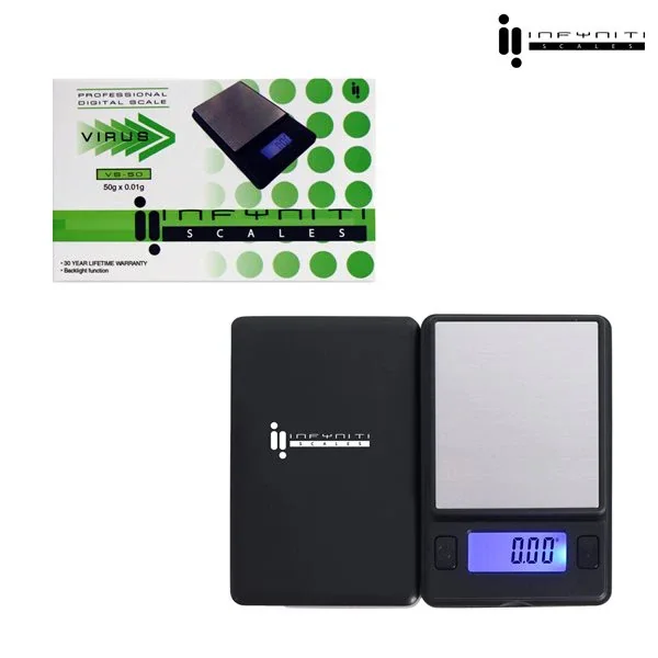 MSRP $13.99 Virus Digital Pocket Scale, 50g x 0.01g The Infyniti Virus VS-50 mini digital scale maintains the high quality of the Infyniti brand with that extra bit of style. Feel like a G with these high quality digital pocket scales. Scale Features: Capacity: 50g Accuracy: 0.01g Digital display with blue backlight Auto shut off after 60 seconds no activity Large stainless steel weighing platform Standard weight auto calibration 2 x AAA batteries included