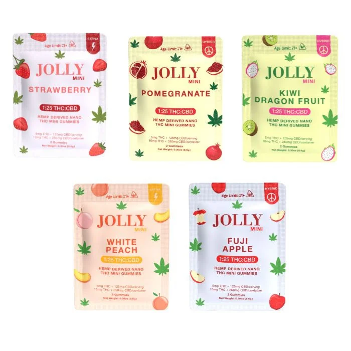Experience everyday wellness with Jolly Cannabis 1:25 THC:CBD Gummies, expertly crafted with 5mg THC and 125mg CBD per gummy. With a gentle 1:25 THC:CBD ratio, these gummies offer calming support for stress, discomfort, and balance—without the high. Each gummy contains 5mg THC + 125mg CBD 2-count packs (10mg THC / 250mg CBD total) – Sold in 30ct display cases 15-count packs (75mg THC / 1,875mg CBD total) – Sold in 5ct shelf-ready cases Perfect for retail and wholesale, these vegan gummies are made with real fruit flavors and natural colors—third-party lab tested for purity and consistency. Available Flavors (Alphabetically): Blackberry Lemon – Tart lemon meets rich blackberry Blue Raspberry – Bright and tangy blue raspberry Fuji Apple – Crisp, juicy Fuji apple Kiwi Dragonfruit – Tropical, exotic fruit fusion Pomegranate – Deep, juicy pomegranate flavor Strawberry – Sweet, sun-ripened strawberry White Peach – Smooth and mellow peach finish Highlights: 1:25 ratio – 5mg THC + 125mg CBD per gummy Available in 2ct (30-pack) & 15ct (5-pack) formats Vegan, natural flavors, USA-made Ideal for wellness-focused customers