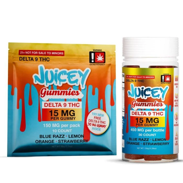 Juicey Gummies Delta 9 THC are crafted with 15mg of Delta 9 THC per cube, offering a precise and enjoyable dosage. With 10 cubes per pack, these gummies provide a tasty and effective way to enjoy Delta 9 THC. Made with natural, non-GMO ingredients, these gummies are vegan-friendly and offer a smooth, controlled experience. Perfect for those seeking a discreet and flavorful THC experience, Juicey Gummies Delta 9 are a great choice for all THC enthusiasts. Juicey Gummies Delta 9 THC Features Precise Dosage: Each cube contains 15mg of Delta 9 THC for controlled consumption. Convenient Packaging: Includes 10 cubes per pack, totaling 150mg of Delta 9 THC. Flavorful Treats: Crafted with delicious flavors for a tasty way to enjoy THC. High-Quality Ingredients: Made with all-natural, non-GMO, and vegan-friendly components. Discreet Enjoyment: Perfect for a sweet treat or subtle THC experience. Premium Standards: Reflects Juicey’s commitment to purity and quality. Juicey Gummies Delta 9 THC Flavors Multi Flavor: Blue Razz, Lemon, Orange & Strawberry: A vibrant mix of tangy and sweet fruit flavors, perfectly balanced for a refreshing and enjoyable treat.