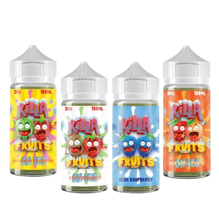 Discover the Killa Fruits Signature Edition, available in 100ml bottles and three nicotine strengths: 0MG, 3MG, and 6MG. Each flavor perfectly balances cool menthol with bold fruit notes, delivering a refreshing and vibrant vaping experience. Flavors: Blue Raspberry: A tangy and sweet blue raspberry flavor, offering a burst of vibrant fruitiness with every puff. Blue Raspberry On Ice: The classic blue raspberry flavor enhanced with a cool menthol breeze, delivering a refreshing and frosty twist. Kiwi Strawberry: A delightful blend of juicy strawberries and tart kiwis, creating a perfectly balanced and fruity vaping experience. Kiwi Strawberry On Ice: Sweet strawberries and tangy kiwi combined with a menthol chill, providing a refreshing and fruity vape with a cool finish. Raspberry Black Cherry Lemon: A harmonious mix of ripe raspberries, dark cherries, and zesty lemon, offering a complex and refreshing flavor profile. Red Apple Peach: Crisp red apples paired with juicy peaches, delivering a sweet and succulent fruit blend that's both satisfying and refreshing. Red Apple Peach On Ice: Juicy red apples and ripe peaches with a menthol twist, creating a fruity and cool vape that's perfect for any time. Strawberry Acai: Sweet strawberries combined with the exotic flavor of acai berries, offering a rich and fruity vape with a touch of tropical flair. Watermelon Nectarine: A juicy mix of ripe watermelon and tangy nectarines, providing a refreshing and sweet fruit flavor that's perfect for summer. Watermelon Strawberry: A luscious blend of juicy watermelon and sweet strawberries, creating a perfectly balanced and refreshing fruity vape. Watermelon Strawberry On Ice: Juicy watermelon and sweet strawberries with a cool menthol finish, offering a refreshing and icy fruit flavor.