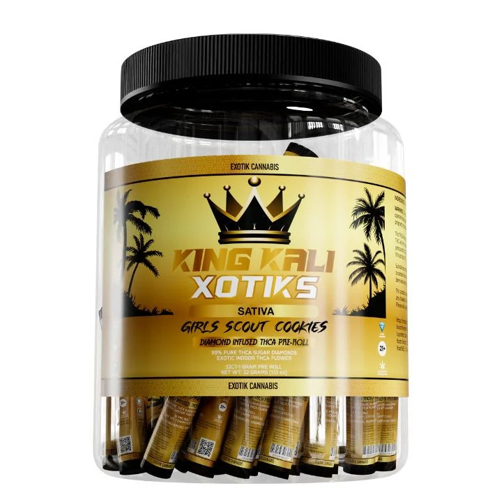 Crafted with premium, high-potency THCA flower, King Kali Xotiks Pre-Rolls deliver smooth, flavorful smoke in a ready-to-enjoy 1G format. Available in Sativa, Indica, and Hybrid strains, these pre-rolls are perfect for retailers seeking consistent quality and customers looking for a rich, terpene-packed experience. Each 32-count display is ideal for shelves or countertop placement. Strain Lineup: Banana Kush – Hybrid: Sweet tropical notes with a mellow, relaxing body high. Blue Dream – Hybrid: Balanced berry flavor with a calm yet uplifting effect. Grandaddy Purp – Indica: Grape and berry flavors with deep body relaxation. Girls Scout Cookies – Sativa: Sweet, earthy flavor with an energetic cerebral buzz. Gorilla Glue – Indica: Pungent and earthy with heavy, sedating effects. King Louis – Indica: Rich pine and musk profile with strong nighttime relaxation. Pineapple Express – Sativa: Fruity and tropical with a happy, energizing high. Super Lemon Haze – Sativa: Zesty lemon flavor with vibrant, euphoric effects. Wedding Cake – Hybrid: Creamy vanilla and tangy flavor with balanced, calming effects.