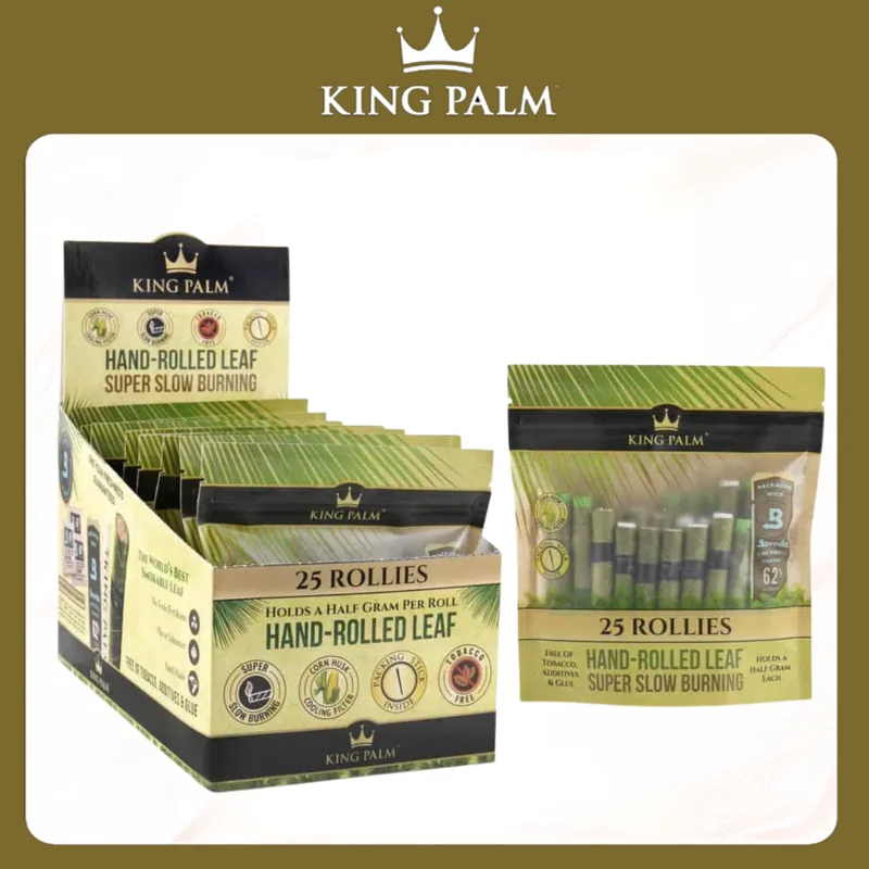 KING PALM - 25 ROLLIES PRE-ROLL POUCH DISPLAY OF 8 8 Pouches per display 25 Rollie Pre-Rolls per Pouch Each pouch includes a packing Stick Includes a Boveda 72% humidity control packet 100% Real Palm Leaf Organic, Non-GMO Corn Husk Filter Tobacco & Chemical Free