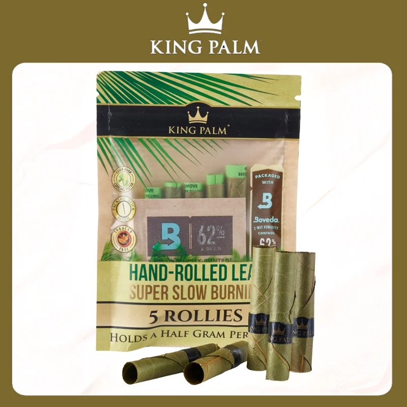 KING PALM - 5 ROLLIES PRE-ROLL POUCH WITH BOVEDA DIAPLAY OF 15 Super Slow Burning - Real Cordia Leaf Free of: Tobacco, Glue, Flavors, & Additives. The natural corn-husk filter will be one of the best filter tips you have ever used. You can also bite or squeeze the tip for a tighter draw, which will result in a cooler smoke. We are confident that you will find these natural leaves to be better quality and much cleaner than the common wrapping papers on the market. Our leaf wraps have a very m