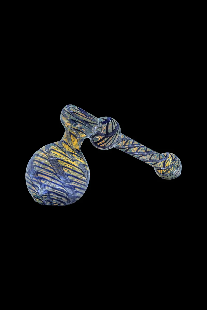 Elevate your smoking experience with the Full Rake Fumed Hammer Bubbler Pipe by LA Pipes ! This 6-inch long beauty has been handmade in sunny Los Angeles using pure silver-fumed borosilicate glass that’s been wrapped and raked in vibrant color. This gorgeous bubbler is designed to cool your smoke with water so you can enjoy a smooth smoking experience minus the coughing and throat irritation that often comes with a dry pipe. The Full Rake Bubbler is a standout piece with its hammer-style design that makes it an easy piece to handle and pass to friends.