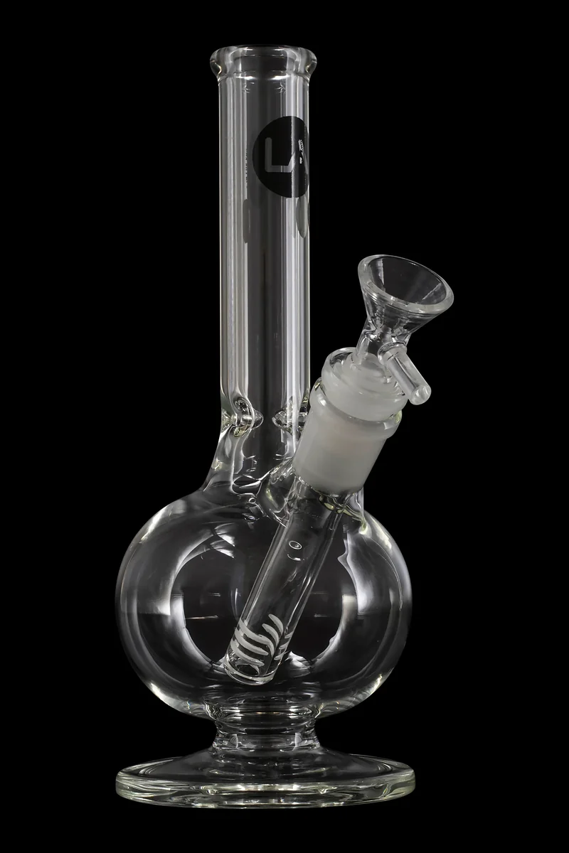 The Simply Guy Pedestal Bong by LA Pipes sits on a lifted pedestal to keep this 9-inch tall water pipe from touching any surface directly. A bubble base is positioned on top of the pedestal just about the ice catcher you can use to cool your rips. This bong is made of thick, clear scientific glass for a classy and sophisticated look. It’s outfitted with a 18.8mm female joint and comes with a removable 18.8mm>14.5mm diffused downstem and a handled 14.5mm male herb bowl. This simple and durable bong makes a great daily driver. It's also suitable for travel and can fit easily into your backpack for taking it on the road. The bong is adorned with a black LA Pipes logo on the neck just below the flarted mouthpiece.