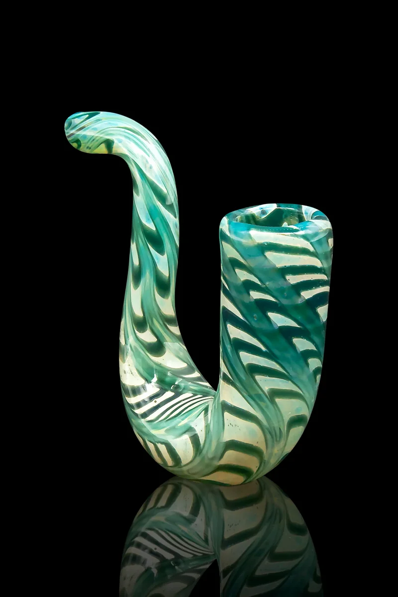 4″-5″ Wrap-n-Rake silver fumed sherlock pipe. Handmade in Los Angeles 4" (Measured diagonally) wrap-and-rake sherlock boro glass handpipe. Clear tubing is covered with colored glass, fumed with pure silver, and raked with clear glass to create this timeless pattern. Did you know it's the same technique used in decorating a cake or your cappuccino? Sherlock pipes are better because if you measure the distance the smoke travels from the ignition source, your smoke travels 3-4 times it does in a standard spoon hand pipe. This means cooler smoke! Yah! You're welcome! Science!