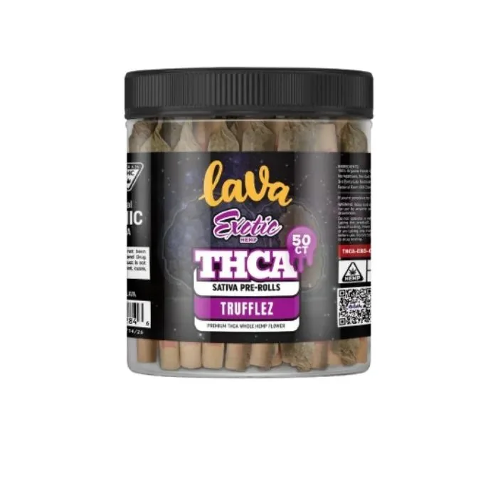 Lava Hemp Exotic THC-A Pre Rolls Jar delivers high-quality pre-rolls made from carefully selected hemp strains for a smooth and potent smoking experience. Each jar includes multiple pre-rolls featuring a variety of flavors, from the earthy AK 47 to the sweet and creamy Runtz. Perfect for relaxation or social sessions, these pre-rolls provide convenience and consistency in every puff, making them a must-have for THC-A enthusiasts. Flavors available: AK 47: A classic strain with earthy and woody notes, AK 47 delivers a smooth and balanced experience, perfect for relaxation with a calming effect. Bubba Glue: A hybrid strain known for its relaxing and tranquil effects, Bubba Glue combines earthy flavors with a touch of sweetness, ideal for unwinding. Blue Dream: This popular sativa-dominant hybrid offers a blend of blueberry sweetness and earthy undertones, delivering a calming yet uplifting effect. Kush Cake: A flavorful hybrid strain with a sweet, dessert-like aroma, Kush Cake offers a relaxing high with notes of vanilla and earthy kush flavors. Purple Gumbo: Purple Gumbo is known for its bold and pungent profile, offering a sweet and earthy flavor profile that delivers a deep, relaxing experience. Runtz: With its fruity and sweet flavor profile, Runtz offers a balanced and enjoyable high, combining tropical notes with a creamy finish for a relaxing experience. Trufflez: This hybrid strain provides a sweet, earthy aroma with hints of chocolate and coffee, delivering a smooth, relaxing effect perfect for evening use. Enjoy smooth, premium hits and a variety of flavors with every pack of Lava Hemp THC-A Pre Rolls.