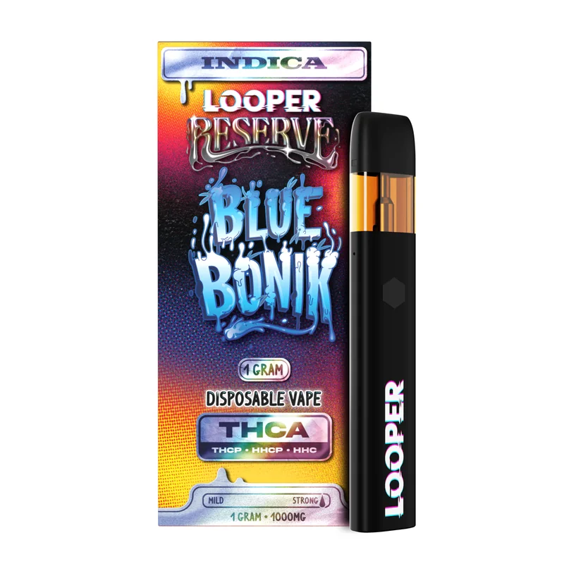 Strain Type: Indica Cannabinoid Blend: THC-A + THC-P + HHC-P + HHC Dominant Terpenes: Limonene, Caryophyllene, Myrcene, Pinene Parent Strains: Zkittlez, Pez Volume: 1g Unwind with the Looper Reserve Blue Bonik Disposable, an indulgent indica crafted for deep relaxation and flavor-packed enjoyment. This potent blend of THC-A, THC-P, HHC-P, and HHC delivers a powerful yet balanced experience, perfect for those seeking a smooth, full-bodied session. Notes of sweet berry and citrus meet hints of earthiness, creating a complex flavor profile that lingers with every puff. Designed for convenience and discretion, this 1G disposable ensures an effortless, elevated escape whenever you need it.