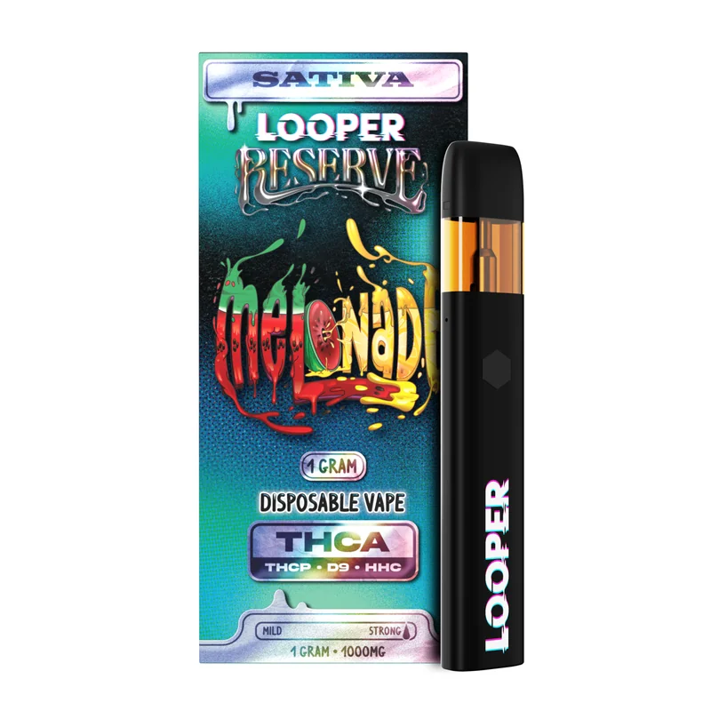 Strain Type: Sativa Cannabinoid Blend: THC-A + THC-P + D9 + HHC Dominant Terpenes: Terpinolene, Valencene, Limonene, Geraniol Parent Strains: Lemon Tree, Watermelon Zkittlez Volume: 1g Bright, citrusy, and refreshingly smooth, the Looper Reserve Melonade Disposable is a sativa powerhouse that keeps you energized and uplifted. Infused with THC-A, THC-P, D9, and HHC, this strain delivers a zesty lemon burst upfront, balanced by juicy melon sweetness and a light floral finish. Expect a clear-headed, creative buzz that fuels productivity while keeping you in a euphoric state. Perfect for daytime adventures, social settings, or a flavorful pick-me-up, this 1G disposable is your go-to for a crisp, refreshing, and invigorating experience.