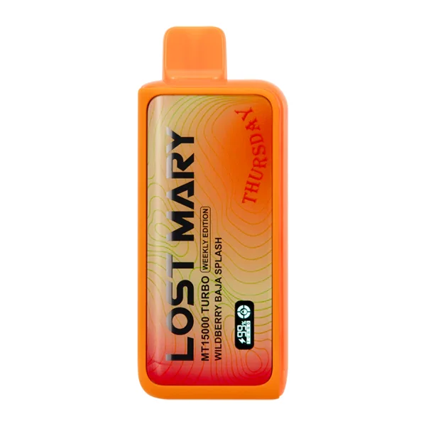 5 PACK OF DISPOSABLE VAPORIZERS Flavor : A dash of wild raspberry and elderberry flavors are added to the tasty citrus Baja Splash in the Lost Mary Wildberry Baja Splash vape. E-liquid contents : 16ml Nicotine Level : 50mg Puffs per Device : 15000 Master Case Qty : 200 (40x 5 Packs) Battery: 600 mAh (Rechargeable via USB-C) Power Mode Settings: Smooth Mode (11W)/ Turbo Mode (22W) Coil: Dual Mesh Coil LED Screen: E-Liquid and Battery Meters Browse more Disposable Vape Brands Here