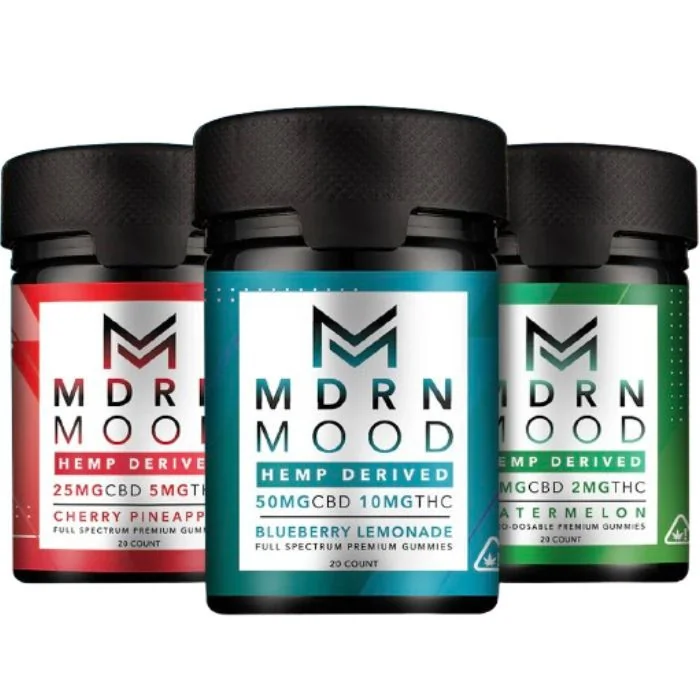 MDRN MOOD offers premium, full-spectrum CBD/THC gummies designed for those seeking wellness and relaxation. With varying THC and CBD strengths, these vegan gummies are crafted in a GMP-certified lab and come with QR codes for full panel lab results. Each flavor provides a unique experience to suit different needs. Flavors: Watermelon (2mg THC, 25mg CBD): A refreshing watermelon flavor paired with calming effects from Delta-9 THC and the wellness benefits of CBD. Ideal for microdosing and beginners. Per Container: 40mg THC, 500mg CBD Per Gummy: 2mg THC, 25mg CBD 20 Gummies Per Bottle Cherry Pineapple (5mg THC, 25mg CBD): This tropical blend enhances the "Entourage Effect," combining CBD and Delta-9 THC for a balanced, potent experience. Perfect for casual users seeking more relaxation. Per Container: 100mg THC, 500mg CBD Per Gummy: 5mg THC, 25mg CBD 20 Gummies Per Bottle Blueberry Lemonade (10mg THC, 50mg CBD): The highest potency offering, designed for those looking for enhanced wellness, calm, and relaxation. A perfect full-spectrum blend of CBD and THC. Per Container: 200mg THC, 1,000mg CBD Per Gummy: 10mg THC, 50mg CBD 20 Gummies Per Bottle Galaxy Grape (25mg THC, 50mg CBD): A robust formula with 25mg THC per gummy, ideal for those seeking stronger relaxation and a full plant profile. Per Container: 250mg THC, 1,000mg CBD Per Gummy: 25mg THC, 50mg CBD 10 Gummies Per Bottle All gummies are 100% vegan, made without high fructose corn syrup, and come in resealable bottles for freshness.