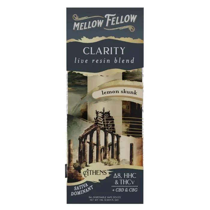 Experience the Mellow Fellow Clarity Live Resin Blend Athens Disposable 1ml, a carefully crafted fusion of Delta 8, HHC, and THCV. Elevate your vaping journey with this uniquely blended disposable vape, designed for a clear and elevated experience. Indulge in the essence of clarity with Mellow Fellow's premium formulation.