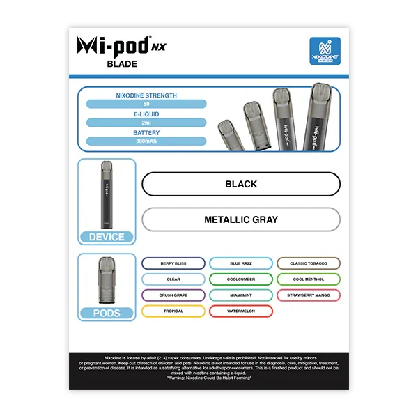 MARKETING MATERIALS Showcase the full range of flavors for the Mi-Pod NX Blade Nixodine vape line with this laminated flavor menu . Designed for durability and visual appeal, this menu highlights the many features of this high-quality and popular product. The 8.5" x 11" laminated design ensures the menu withstands daily use in vape shops , smoke shops and convenience stores. It will help your customers easily explore the variety of available flavors. Perfect for in-store displays, this flavor menu adds a professional touch to your vape section. Key Features: Dimensions: 8.5" x 11" Laminated for durability and long-lasting use Features Mi-Pod NX Blade Nixodine Vape Displays a full list of flavors for customer convenience Limit: 5 menus per store View more Marketing Materials for all brands here