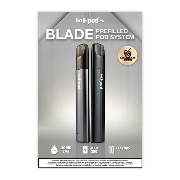 Showcase the Mi-Pod Blade nixodine vape with this striking 12-inch by 18-inch poster , perfect for drawing attention to this high-demand product. Designed to make an impact in your storefront windows or interior displays , this poster highlights the premium quality and style of this popular product. A must-have marketing tool for vape shops, smoke shops, and convenience stores looking to boost visibility and sales for this impressive product line. Key Features: Dimensions: 12" x 18" Promotes the Mi-Pod NX Blade with Nixodine Ideal for store windows and in-store displays Eye-catching design to increase customer interest and sales Limit of 2 posters per order View more Marketing Materials for all brands here