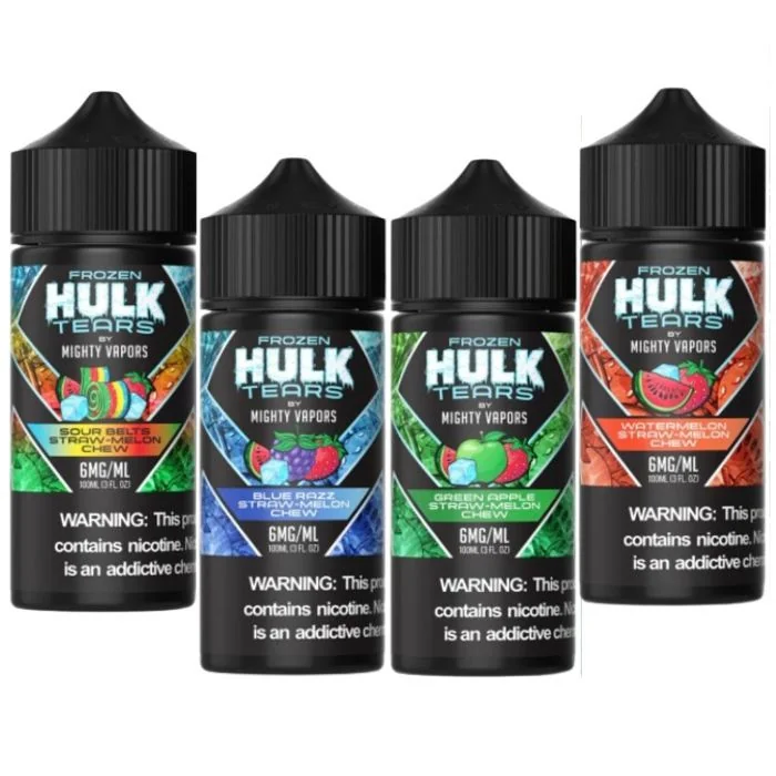 Frozen Hulk Tears x Mighty Vapors E Liquid brings a frosty blast of flavor in every hit, crafted for sub-ohm users who crave thick clouds and smooth delivery. With a 70/30 VG/PG ratio, it’s tailored for high-performance setups and flavor enthusiasts alike. The icy profile hits clean and cool, delivering satisfying refreshment all day long. Whether you prefer 3MG or 6MG nicotine, the generous 100ml bottle ensures long-lasting enjoyment without constant refills. Ideal for vapers who want a bold flavor and high vapor output, this Mighty Vapors blend keeps things chill without sacrificing performance. Frozen Hulk Tears x Mighty Vapors E liquid Features: VG/PG Ratio: 70/30 blend for rich flavor and thick vapor production. Vaping Style: Ideal for sub-ohm vaping and high-performance setups. Flavor Profile: Delivers an icy, refreshing taste with every puff. Nicotine Options: Available in 3MG and 6MG strengths. Bottle Size: Comes in a generous 100ml for long-lasting enjoyment. Vape Experience: Designed for smooth, flavorful, and cool hits. Frozen Hulk Tears x Mighty Vapors E liquid Flavors: Frozen Blue Razz Straw Melon Chew: Dive into a refreshing blend of blue raspberry and melon with a hint of chewy sweetness, enhanced with an icy menthol finish for a cool, invigorating vape. Frozen Green Apple Straw Melon Chew: Enjoy the crisp and tangy taste of green apple combined with the sweet juiciness of melon, all wrapped in a refreshing menthol chill that delivers a balanced and exhilarating flavor experience. Frozen Hulk Tears Straw Melon Chew: Experience a powerful mix of sweet and tangy fruits with a chewy melon base, complemented by a frosty menthol breeze that will leave you feeling invigorated and satisfied. Frozen Mango Straw Melon Chew: Indulge in the tropical sweetness of ripe mango paired with the refreshing taste of melon, topped off with a cool menthol exhale that brings a delightful chill to your vaping experience. Frozen Sour Belts Melon