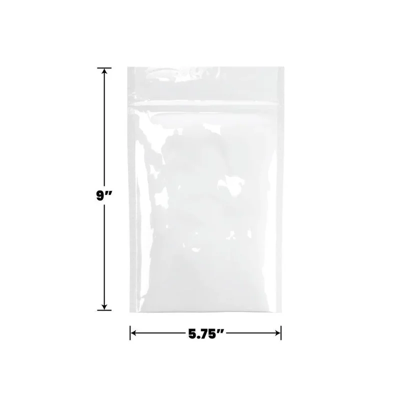 Dimensions: 5.75" x 9" Sticker Area: 5.25" x 6" Recommended Label Size: 4" x 6" Color: Full White (White Front and White Back) Capacity: 1 Ounce This Bag is Heat Sealable Gloss Square Edges Opaque in color so it's naturally UV blocking! Ideal for Edible or Flower Packaging What size Mylar Bag do I need? Mylar Bag may have a hang hole. The hanging hole allows hanging on a pegboard or display stand. Bags are Pre-Zipped to Ensure a Sanitary Interior, Protect Against Dust, Debris, and Handling During Transit