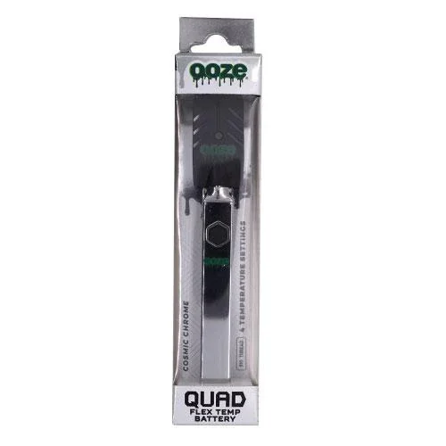 MSRP $17.99 The Ooze Quad battery is a 510 thread, 500 mAh vape pen battery with a square shape. This new shape actually protects the cartridge, your battery will never roll off the edge of the table, cracking your cartridge again! This is a flex temp device; cycle through the 4 voltage levels by clicking the button 3x. This battery will shut off after sitting idly for 12 minutes, which greatly extends the time between charges. Each Quad includes an Ooze Smart USB charger, as well as a USB-C charging port on the very bottom. This square vape battery is Patent Pending. SQUARE PEN BATTERY | The Ooze Quad vape pen battery has 4 flat sides that allow it to lay flat on a surface. The Quad will never roll off the table, cracking your precious cartridge. SLEEK LOOK | This battery has a discreet, matte black finish. Fly under the radar with a device that doesn't draw attention to what you're doing. 510 THREAD | This is a 510 thread device that is intended to be used with all sorts of pre-filled extract, essential oil, and delta-8 oil cartridges. It can also be used with concentrate attachments for dabs. FLEX TEMP | The Quad is a 500 mAh flex temp battery, meaning that it has different temperature options for different types of extracts. Click the button 3x to cycle through the 4 voltage levels: 2.7V, 3.2V, 3.7V, and 4.2V. SMART CHARGING | This battery can be charged from either end. An Ooze Smart USB charger is included in the package, and provides overcharge protection. A USB-C charging port can be found on the very bottom (charger sold separately).