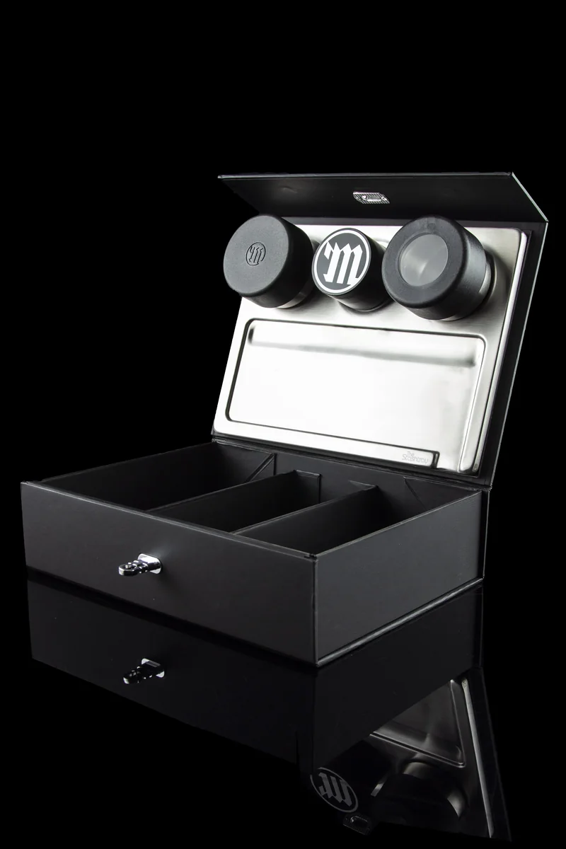 Myster's Stashtray Bundle is the gift that keeps on giving. This kit includes everything you could ever need to streamline your smoking ritual with style and efficiency: Stainless Steel Rolling Tray Myster Strain Container 4 Part Myster Grinder Ashtray with Pipe Cleaning Spike Hand Made StashBox Each item fits snugly into the box, reducing desktop clutter and ensuring your sesh is organized and efficient. It's your one stop shop for every stage of the process from start to finish. Ditch the shoebox and start living like the successful stoner you are. The magnetic grade stainless steel tray is made from two stamped sheets that are hand-welded together to form a mirror finish around the edge. The container creates a tight seal with sonic welding around the viewing lens. The four-part aluminum grinder is top-quality. The top of the ashtray flips over and becomes a bowl stand for both 14mm and 18 mm. The StashBox (included) allows you to pack up everything and place it on your shelf.