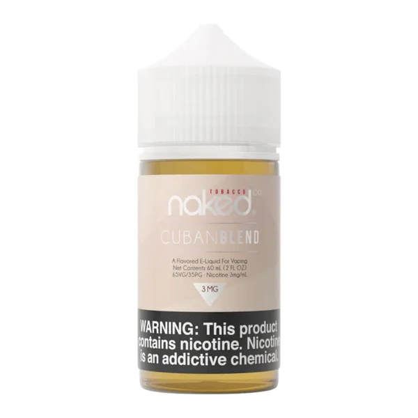 Naked100 Tobacco eJuice Flavor: The Cuban Blend e-Juice by Naked100 uses a rich Cuban cigar inspired tobacco blend in a 65/35 VG/PG blend that works well in sub-ohm vape tanks and vape pod devices. E-Liquid Size : 60ml Nicotine Level : 3mg · 6mg VG/PG Ratio: 65/35 Browse more E-Liquid Brands here