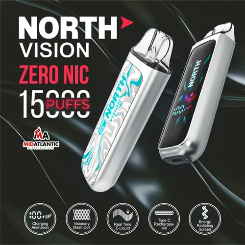 North Vision 15K Puffs 0mg (Zero Nic) 15mL Disposables w/ Energy Radiating Screen *Display of 5* Designed for those who seek a premium experience without the adverse effects of nicotine, the North Vision 15K Puffs 15ML Zero Nicotine Disposable Device...