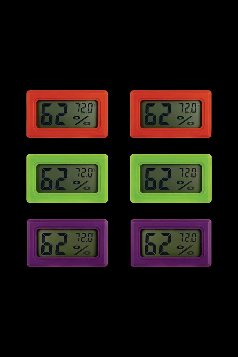 The ONGROK Digital Hygrometer is ideal for use in humidors, sealed jars, bags, pouches, or wherever you need to keep tabs of the humidity and temperature. This mini digital hygrometer features a clear LCD screen so it's easy to ready, even from a distance. The display shows the temperature in Fahrenheit at a range from 58F to 158F. The unit is powered by two LR44 button cell batteries that come with it. The ONGROK Digital Hygrometer is sold in a 6-pack only. The 6-pack comes in 3 vibrant colors which is great for organizing and separating your items.