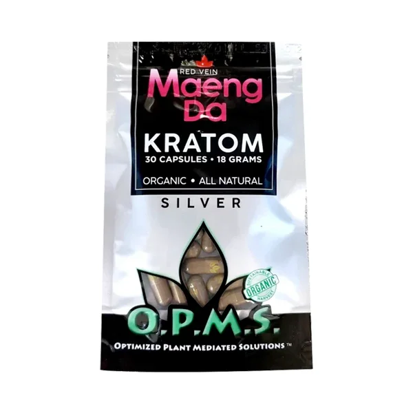 OPMS Silver Red Vein Maeng Da Capsules O.P.M.S. Silver Capsules combine premium Kratom leaf are one of the most established and trusted products on the market. Red Vein Maeng Da uses potent, mature kratom leaves. Capsule = 0.6g 100% organically grown and harvested at its peak maturity for the best experience OPMS uses a unique cold-water extraction process that enhances alkaloid content Other Ingredients: Vegetable Starch & Gelatin Capsules.