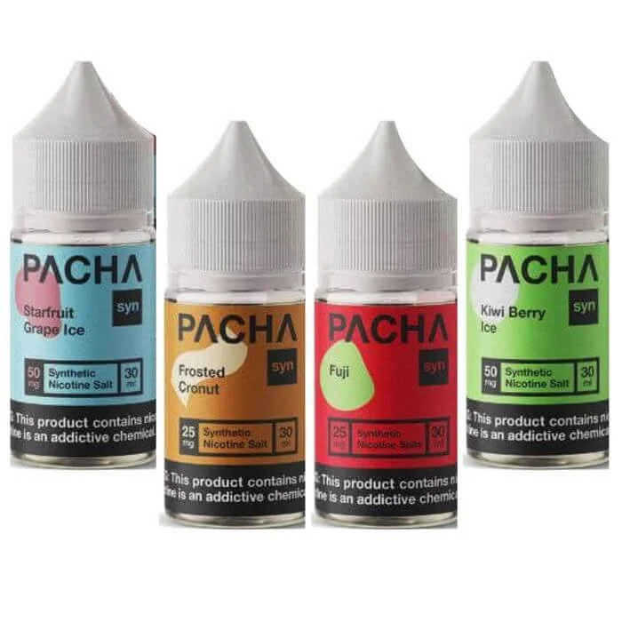 Pacha Syn Nicotine Salts in 30ml bottles are designed for those seeking a rich, smooth vape experience. Available in 25mg and 50mg nicotine strengths, they deliver a satisfying throat hit without harshness. Crafted for consistency, Pacha Syn Nicotine Salts feature a rich flavor profile that ensures an enjoyable experience from start to finish. Whether your customers prefer a lighter or more intense nicotine experience, the product’s versatility makes it an ideal choice for your store. Offering both quality and satisfaction, it’s perfect for all vapers looking for premium nicotine salts. Pacha Syn Nicotine Salts Features: Bottle Size: 30ml, compact and convenient. Nicotine Options: Choose between 25mg and 50mg strengths for a tailored experience. Flavor Profile: Offers a range of rich and satisfying tastes. Smooth Experience: Perfectly crafted for a seamless and enjoyable vape. Premium Quality: Ensures consistency and vibrant flavor in every puff. Pacha Syn Nicotine Salts Flavors: Apple Tobacco: A smooth blend of crisp apple and rich tobacco. Black Ice Menthol: A refreshing mix of cool menthol and dark berries. Blueberry Lemonade: A zesty fusion of sweet blueberries and tart lemonade. Citrus Medley: A vibrant mix of citrus fruits for a tangy experience. Cherry Limeade: A delightful combination of sweet cherry and zesty lime. Frosted Cronut: A sweet and indulgent bakery flavor with a frosty twist. Fuji: The crisp and sweet taste of Fuji apples. Fuji Ice: Fuji apple flavor with a refreshing icy finish. Golden Peach Pineapple: A tropical blend of juicy peach and tangy pineapple. Honeydew Melon: Sweet and refreshing honeydew melon. Iced Blue Razz: A cool and tart blue raspberry flavor. Iced Watermelon: Refreshing watermelon with a hint of ice. Icy Mango: A chilled mango flavor for a tropical refreshment. Kiwi Berry Ice: A fruity blend of kiwi and berries with a cool finish. Kiwi Guava Passion Fruit: A tropical fusion of kiwi, guava, and passion f