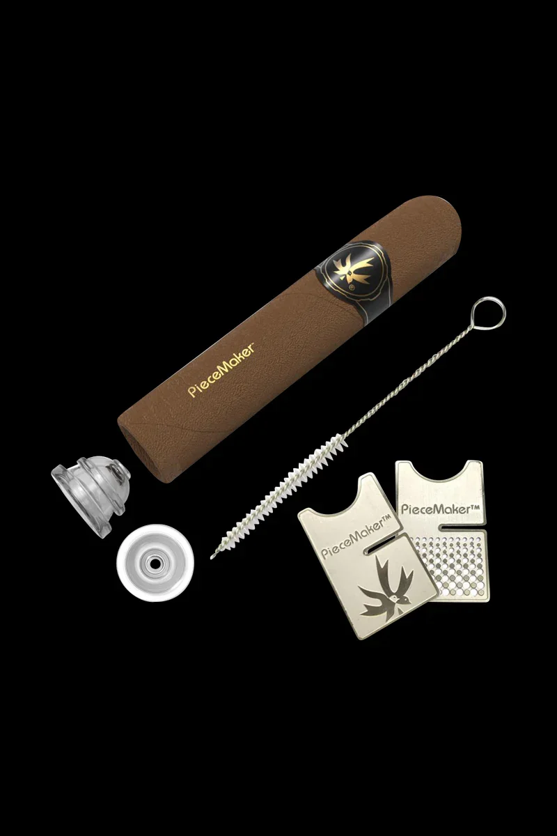 With the appearance of a stylish cigar, you can kick back, put your feet up, and enjoy your favorite dry herbs using the Piecemaker Kuban . This chillum-style hand pipe is made of durable & flexible silicone and has a cigar-shaped body. It features a U-shaped glass bowl insert and an attached cap. Included with the 4.4-inch long Piecemaker Kuban is an accessory set. The set includes a cleaning tool and a grinder card that doubles as a stand. When you enjoy a smoke with your Kuban, onlookers will assume you're simply enjoying a fine cigar. This pipe is perfect for travel because it's portable, discreet, and virtually indestructible. The pipe comes with a black or gold band.