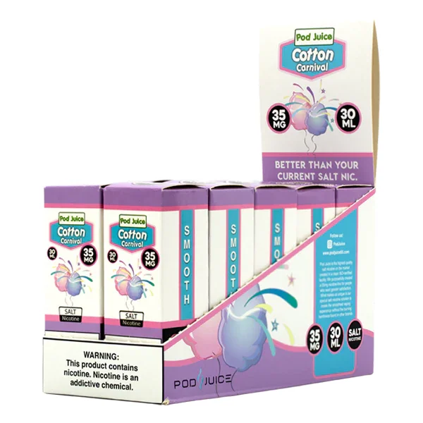 NICOTINE SALTS | PACK OF 10 Flavor : Cotton Clouds by Pod Juice, formerly known as Cotton Carnival, is a twirled blue raspberry and pink vanilla burst in your mouth with a light, fluffy fizz that will take you back to amusement park fun — and all without the sticky fingers! E-liquid contents : 30mL Nicotine Strengths : 20mg, 35mg and 55mg Blended for use with Pod Systems Browse more E-Liquid Brands Here