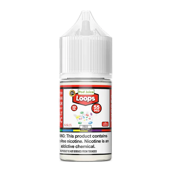 NICOTINE SALTS | INDIVIDUAL BOTTLE Flavor : The Loops Pod Juice salt nic juice uses a mix of fruity and creamy flavors that will remind you of a popular cereal taste. E-liquid contents : 30mL Nicotine Strengths : 20mg, 35mg and 55mg Blended for use with Pod Systems Browse more E-Liquid Brands Here
