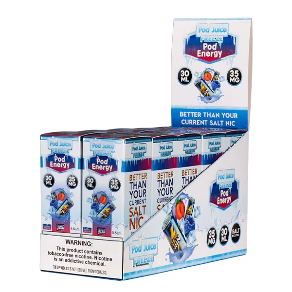NICOTINE SALTS | PACK OF 10 Flavor : The Pod Energy Freeze vape juice flavor from Pod Juice mixes a familiar energy drink taste with an icy finish. E-liquid contents : 30mL Nicotine Strengths : 20mg, 35mg and 55mg Blended for use with Pod Systems Browse more E-Liquid Brands Here