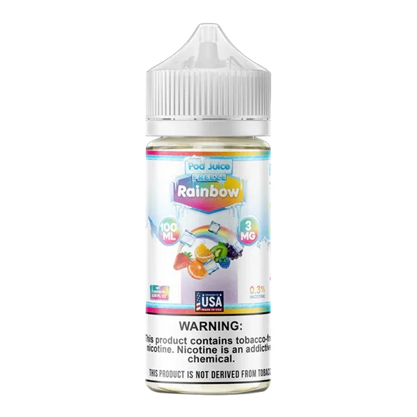 POD JUICE VAPE JUICE 100ml Flavor : The wholesale Rainbow Freeze POD J uice 100ml features a fruit confection rainbow flavor with a blast of chilly ice. This is a high-VG formula for mod users and lower-nicotine vape customers. Browse Mi-Pod's selection of wholesale vapes and hardware today. E-liquid contents : 100mL Nicotine Strengths : 3mg and 6mg VG/PG Ratio: 70/30 Blended for use with vape mods, sub-ohm coils, and lower resistance pods. Browse more Wholesale E-Liquids