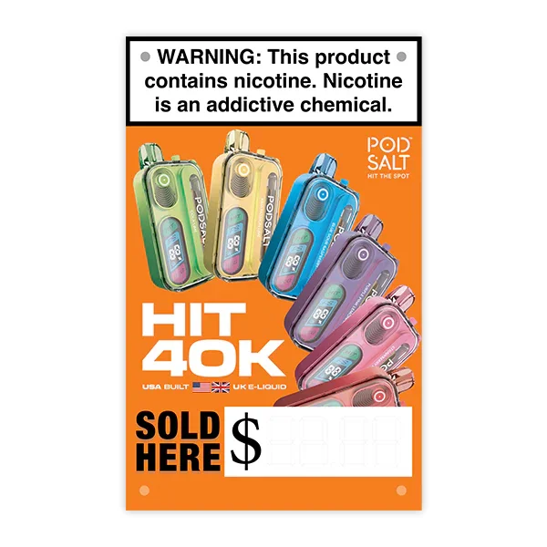 POD SALT HIT 40K Banner Vinyl Banner - 15"x24" - Durable Indoor & Outdoor Marketing Display Boost your store’s visibility with this high-quality POD SALT HIT 40K vinyl banner . Measuring 15 inches by 24 inches , this banner is designed for maximum impact in both indoor and outdoor settings . Draw attention to this USA-filled disposable vape with premium UK e-liquids. Featuring 4 pre-installed grommet holes , it’s easy to hang in multiple locations like windows, walls, or outdoor displays. The durable vinyl material ensures long-lasting use, even in challenging weather conditions. Ideal for vape shops and retail environments . Limit of 2 banners per order . Key Features: Dimensions: 15" x 24" Durable vinyl material for indoor and outdoor use 4 grommet holes for versatile hanging options Weather-resistant design for longevity Perfect for vape stores, retail stores, smoke shops and promotional displays Mi-Pod is your number one source for wholesale vapes , hardware, and alternative products. View more Marketing Materials