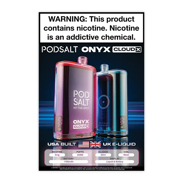 Pod Salt Onyx Cloud X 12 x 18 Display Poster Showcase the POD SALT ONYX CLOUD S with this striking 12-inch by 18-inch poster , perfect for drawing attention to this high-demand product. The USA-filled Pod Salt Onyx Cloud X provides lower nicotine, vape mod style performance with premium UK-made e-liquids. Designed to make an impact in your storefront windows or interior displays , this poster highlights the premium quality and style of this popular product. A must-have marketing tool for vape shops, smoke shops, and convenience stores looking to boost visibility and sales for this impressive product line. Key Features: Dimensions: 12" x 18" Promotes the POD SALT ONYX CLOUD X Ideal for store windows and in-store displays Eye-catching design to increase customer interest and sales Limit of 2 posters per order Branded Marketing Materials