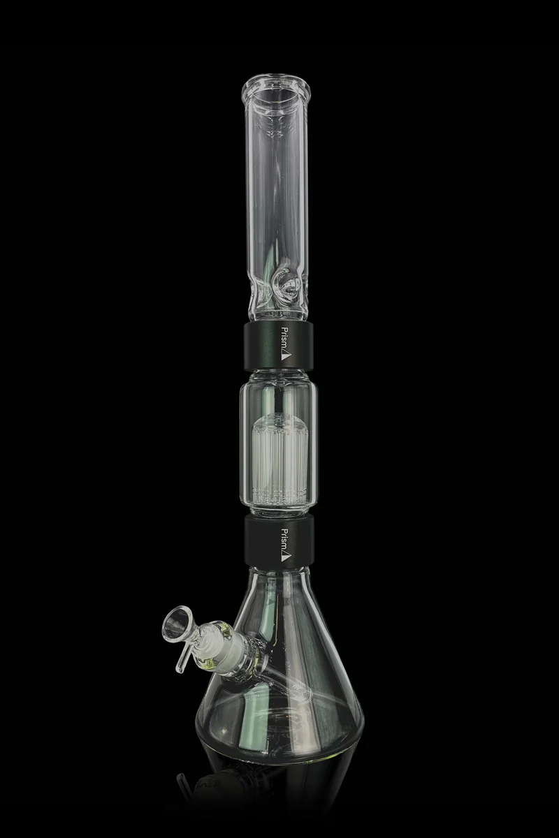 If you’ve been putting off buying a big bong because you need a travel-friendly piece, take a look at the 20-inch tall Halo Beaker Double Stac k by Prism . Even though this is a big bong, it can travel with you wherever you go because it’s a modular piece with interchangeable parts. Simply loosen the aluminum halo threaded connectors to break the bong down and you’re good to go. And since you can take this water pipe apart, it’s easy to clean to keep it looking like new. The Halo Beaker Double Stack is made in the USA using thick and durable clear boro glass. It’s outfitted with a 18.8mm female joint and comes with a 18.8mm>14.5mm removable downstem diffuser and a 14.5mm male herb slide. There’s a big tree percolator in the bottom chamber that breaks up and filters the smoke. The 6-inch wide beaker base provides excellent stability during use. There’s a whole lot to love about this water pipe including the ice catcher built into the neck for adding some frostiness to your rips. This gorgeous percolation beast is available in multiple halo colors.