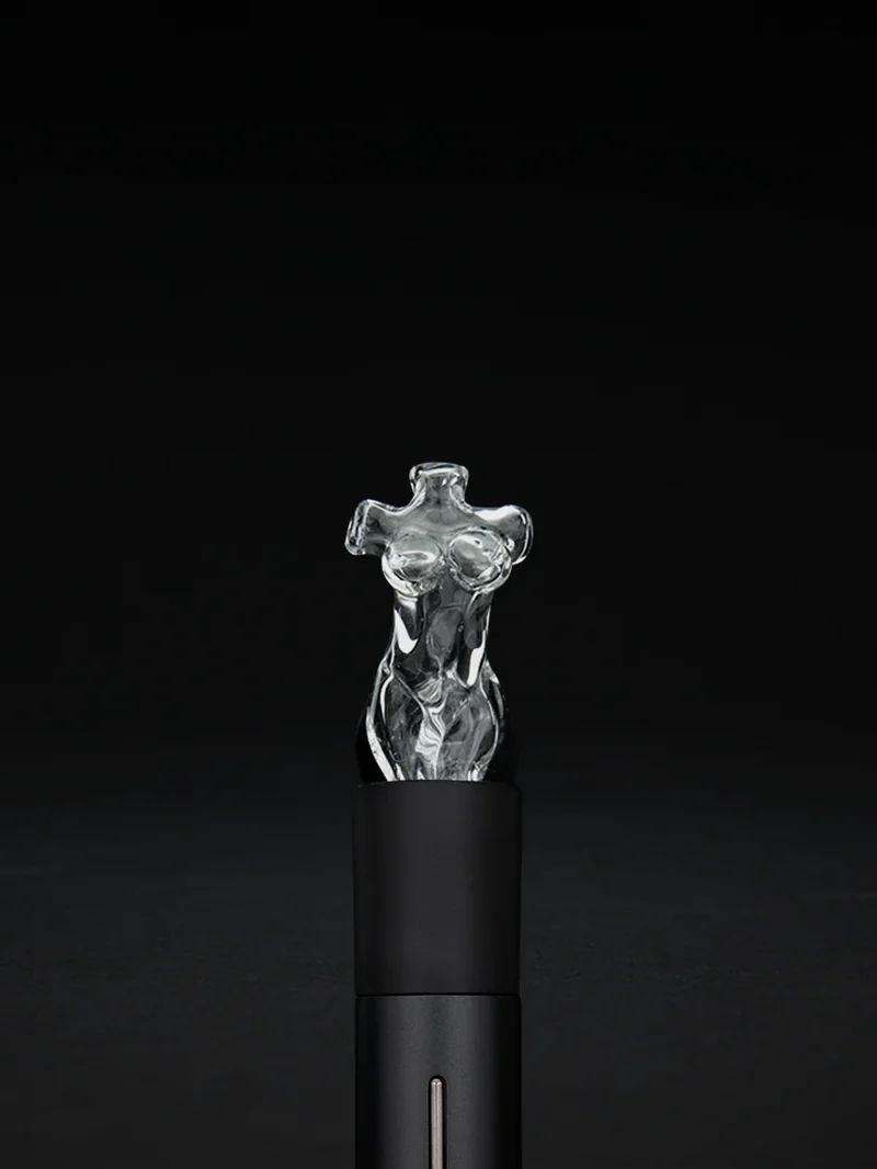 This glass mouthpiece is designed to replicate a torso and features hand-dremeled directional airflow holes that help spin your glass pearl during use, improving airflow and creating a smoother experience. Functional and sculptural, it adds a unique form to your setup without sacrificing performance. Pearl not included. Device not included. All sales final.