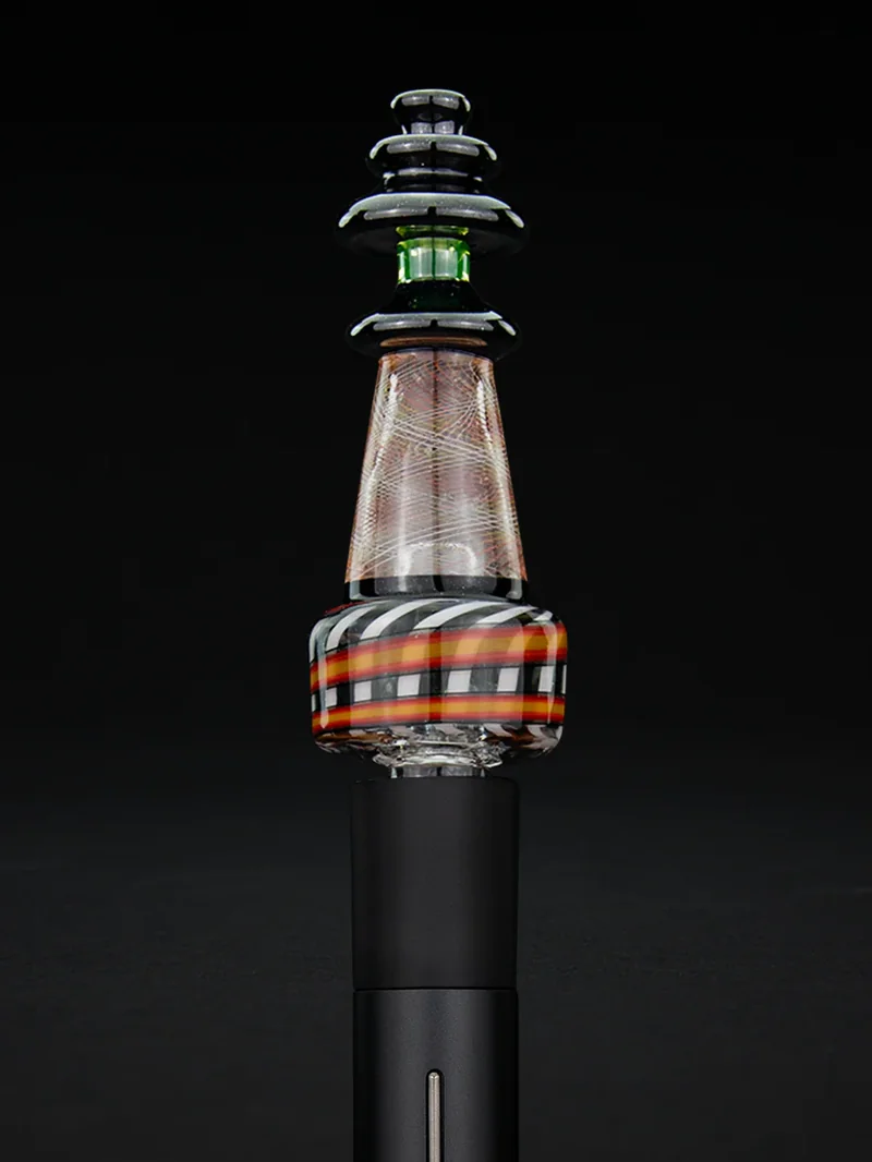Your light in the dark. A fire-fade staircase with retti pattern line work illuminates the Lighthouse Pivot Bubbler. Crafted with UV-reactive ion and galaxy black glass. - water filtration Device not included. All sales final.