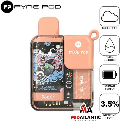 Pyne Pod Boost 8500 Puffs 50mg 10mL Disposables *Display of 5* The Pyne Pod Boost Disposable is a smart vaping device with boost mode, type-c fast charging, long battery life, and eye-catching designs. How it works: It is a draw activated device with...